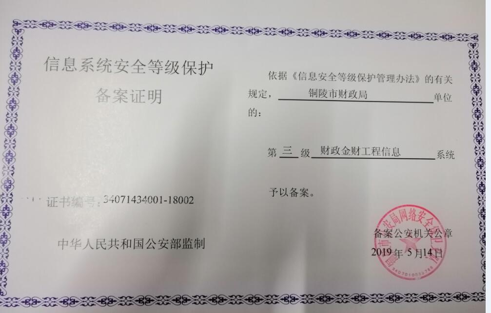 銅陵財(cái)政局順利通過信息系統(tǒng)安全等級(jí)保護(hù)評(píng)級(jí)備案