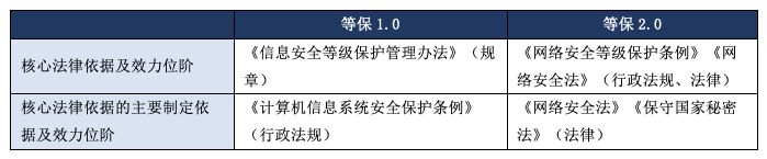 《中華人民共和國網(wǎng)絡安全法》明確規(guī)定“國家實行網(wǎng)絡安全等級保護制度“,相關法律條文和標準也需保持一致性,“等保2.0”將原標準的“信息系統(tǒng)安全等級保護”改為“網(wǎng)絡安全等級保護”,例如《信息系統(tǒng)安全等級保護基本要求》改為《網(wǎng)絡安全等級保護基本要求》。