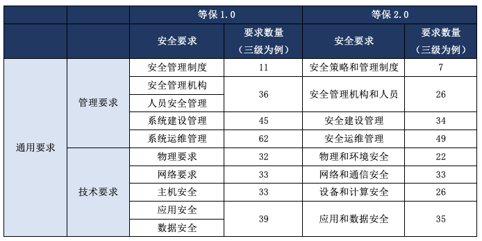 從定級備案等五個規(guī)范性動作到進一步強化具體安全保護措施的落實,保護要求不斷增強。技術標準分為《基本要求》《測評要求》《安全設計技術要求》2.0國家標準,增加新技術新應用安全保護要求。等保2.0通過對原有標準的重新合并整合后有所縮減,以三級為例,管理要求和技術要求內(nèi)容和數(shù)量的變化: